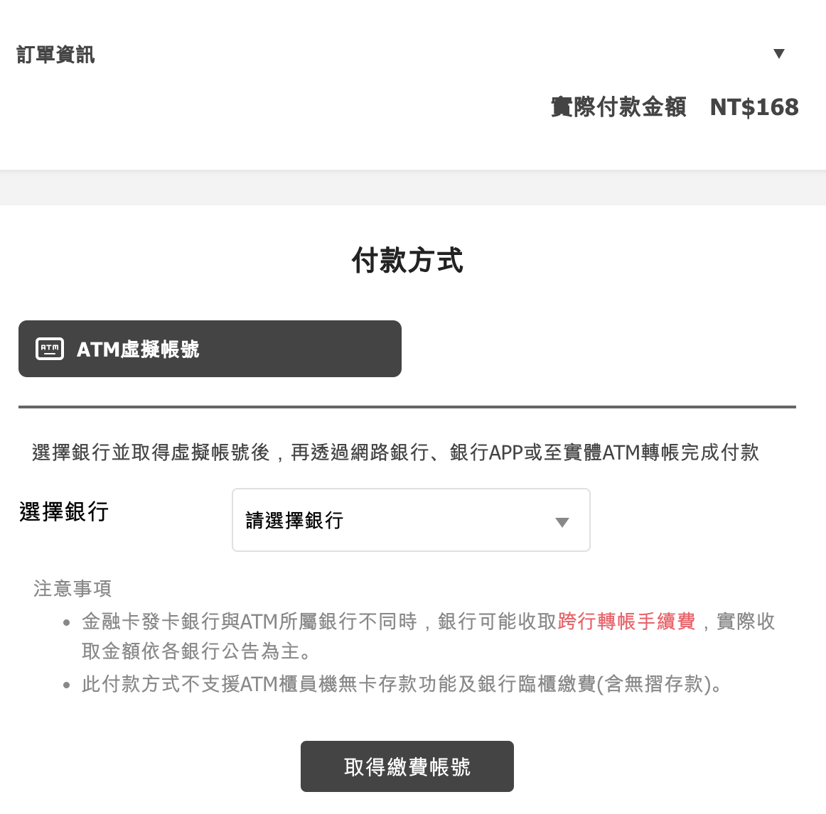 頁面到綠界金流後,請選擇要轉入的銀行,再按「取得繳費帳號」
