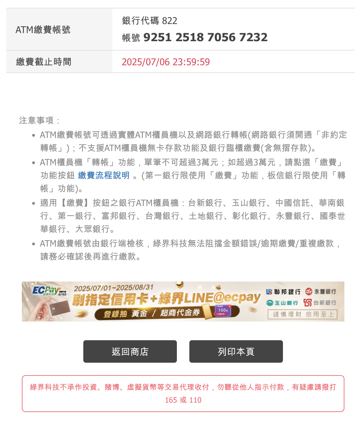 6. 依照畫面上的銀行帳號資訊匯款後,再按下方的「返回商店」